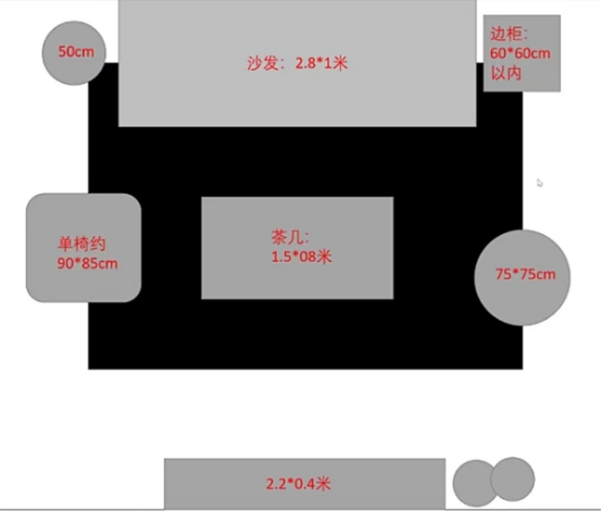 茶几按照空间大小选择,茶几与沙发之间的距离为40-50cm,茶几与电视柜间距离至少一人走位空间80㎝以上,地毯大于沙发两侧30cm左右