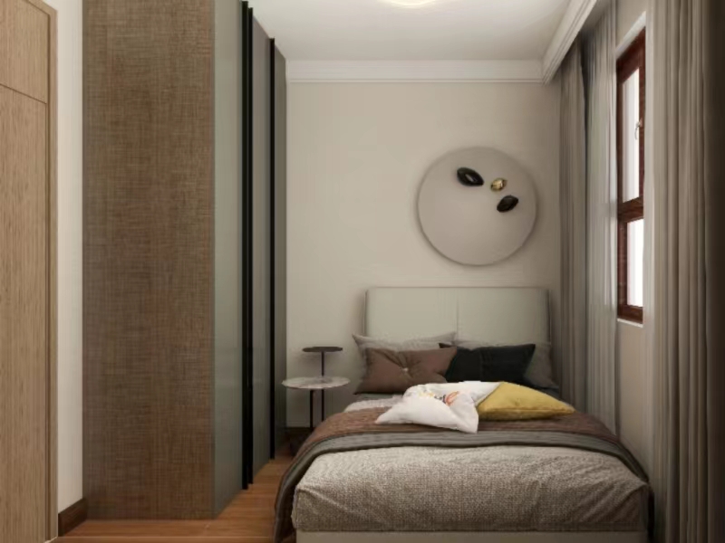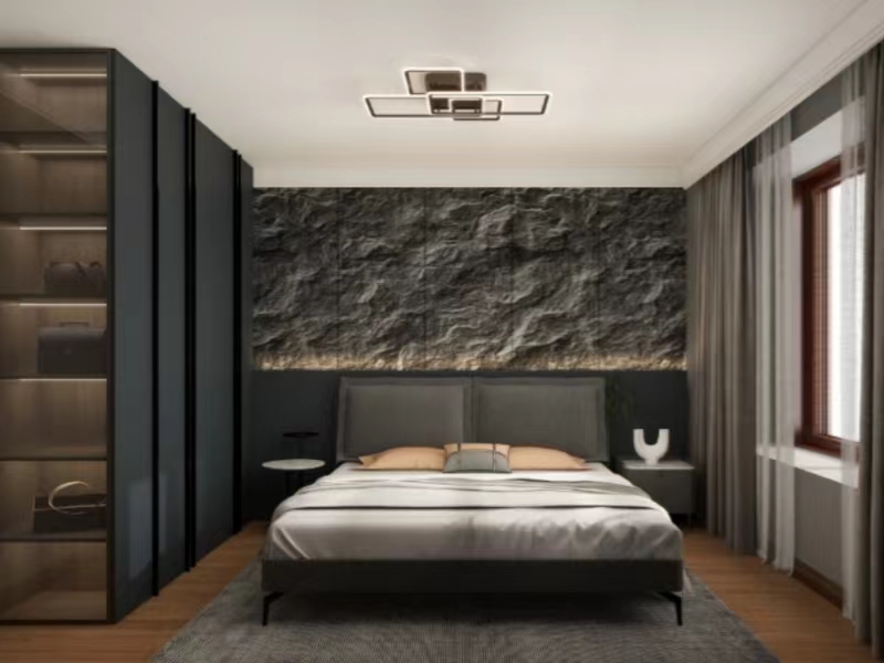 主卧室以大面积灰构成温文尔雅的心情居所,PU石墙板带给空间丰富的表情。