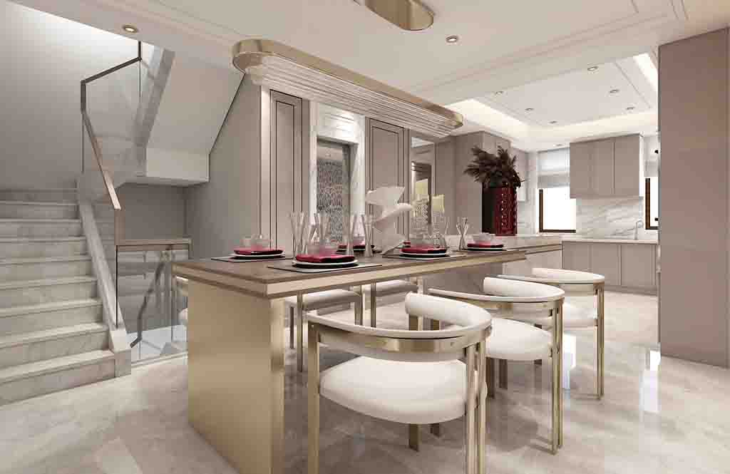 玄关休闲处以表面肌理强烈的石皮,构成一处宁静的空间端景,客厅沙发与电视背景前后以铺一灰色阶的色调搭配,考虑灰阶对象的质感,对比关系中互相衬托互相协调,色彩运用低饱和度具分量感。以及客厅特别设计的橘色沙发等颜色跳跃细致的家具恰到好处,让这个空间变得温馨。厨房白色的橱柜,以及雅士白的柱子,给人一种轻盈感,营造出清澈舒适而雅致的氛围。白灰组合成的空间关系,使空间富有层次感和立体感,空间有了明暗的等级分布。长春装修哪家好,别墅装修,就选东易富盛德15643617732