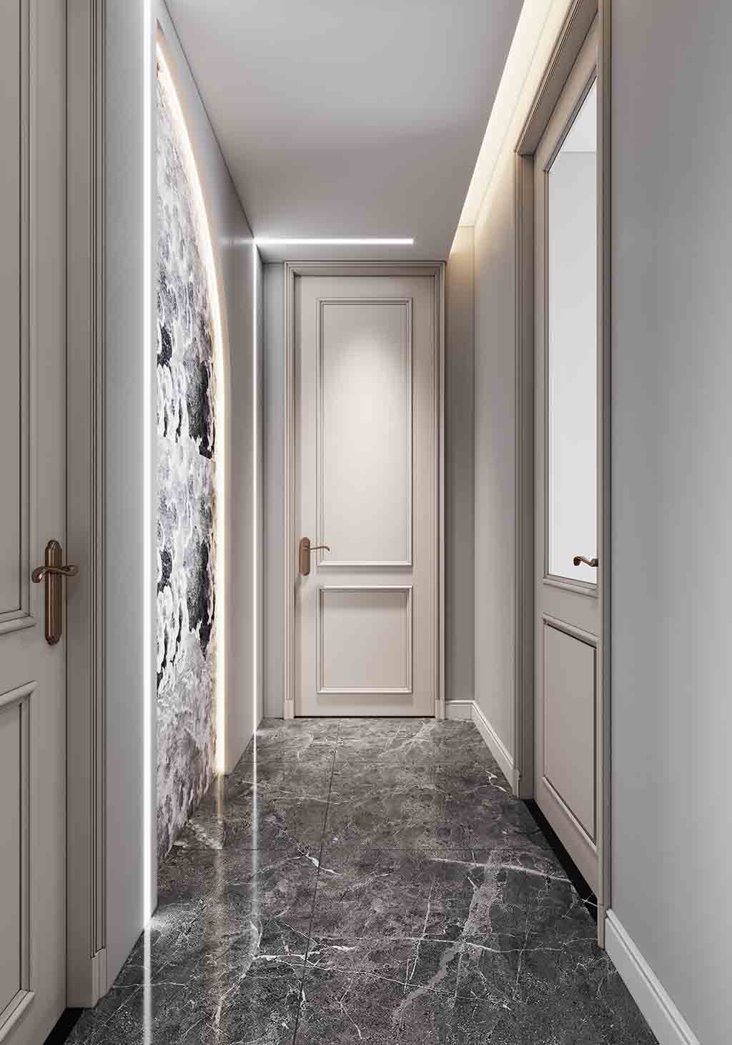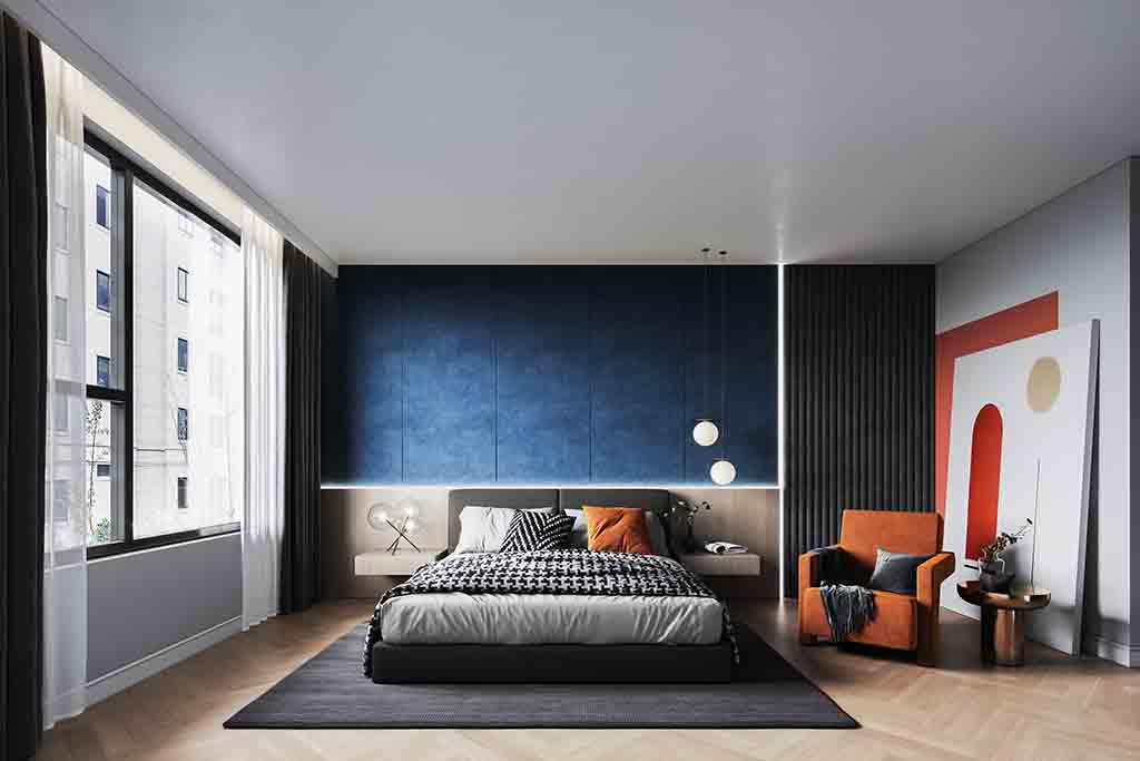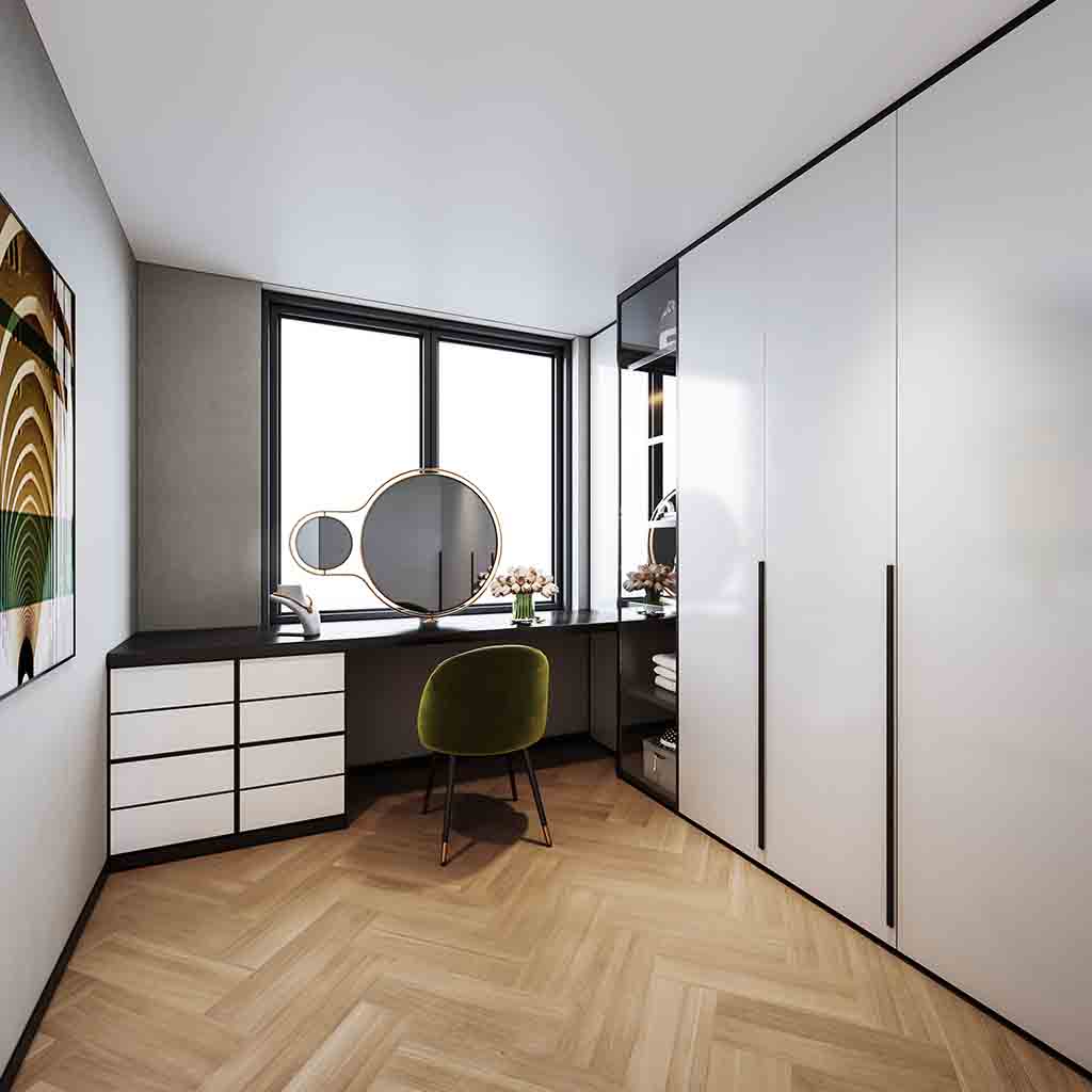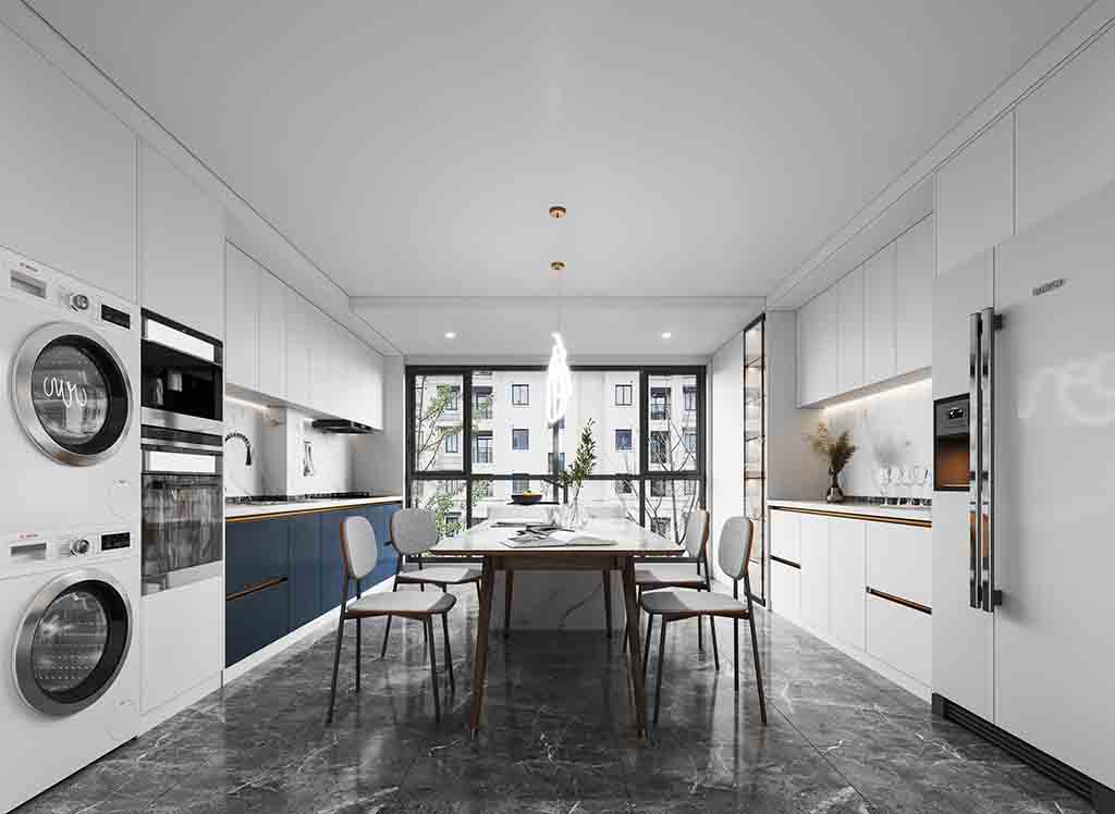 本案是未来一对新婚夫妇作为婚房使用的,其中女主人十分热爱美式风格中所代表的浪漫的元素。所以主要还是采用简约美式的风格外加一点金属的小轻奢风。整体空间的颜色以浅色调为主外加绀青色加以点缀,蓝色所隐喻的是绅士所代表的寓意是忠诚与长远。当曲线轻柔的浅色遇上雕刻温和的蓝优雅清新与温暖矜贵的结合天空便如画卷般展开,浪漫的气息也随之而来,在功能和使用上做到了极大的协调,让整个空间熠熠生辉。每个空间的设计,都是符合既定场景和使用需求,没有过分的渲染和浮夸,这样的设计是真的凸显优雅。 不同于传统的美式空间的高调、奢华、繁复。保留了美式的优雅和轻奢的调性,结合现代家居生活的场景进行设计,这样的设计不会有宫廷式的压抑,反倒是多了轻松的优雅。就算是最简约主义的设计空间也应该是有层次感,只是它被简化了而已,而不是变得单调到乏味。 林清玄说:“浪漫,就是浪费时间慢慢吃饭,浪费时间慢慢喝茶,浪费时间慢慢走,浪费时间慢慢变老。”当婚礼最后一句“Yes , I do.”说出口,脑海里已经勾勒出余生的整幅画卷。婚后的生活可以是柴米油盐酱醋茶,也可浪漫、可优雅。