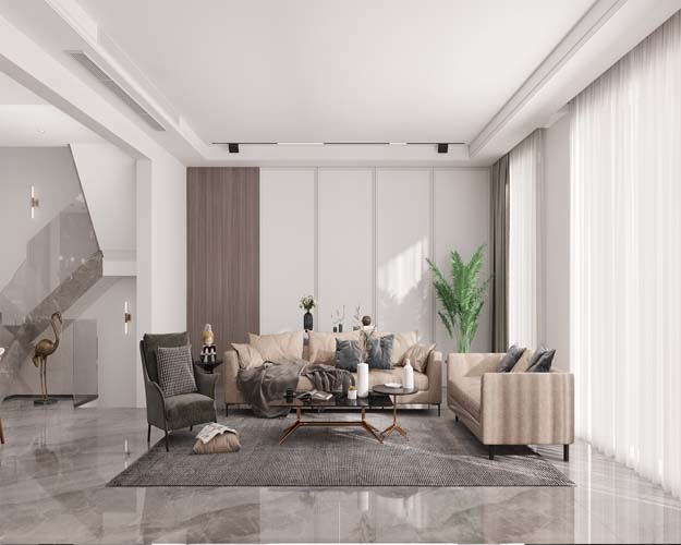 玄关休闲处以表面肌理强烈的石皮,构成一处宁静的空间端景,客厅沙发与电视背景前后以铺一灰色阶的色调搭配,考虑灰阶对象的质感,对比关系中互相衬托互相协调,色彩运用低饱和度具分量感。以及客厅特别设计的橘色沙发等颜色跳跃细致的家具恰到好处,让这个空间变得温馨。厨房白色的橱柜,以及雅士白的柱子,给人一种轻盈感,营造出清澈舒适而雅致的氛围。白灰组合成的空间关系,使空间富有层次感和立体感,空间有了明暗的等级分布。长春装修哪家好,别墅装修,就选东易富盛德15643617732